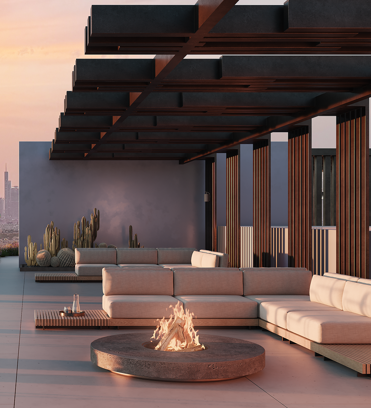 Уютная зона отдыха с диванами и открытым огнем, идеально подходящая для расслабления под звездами.