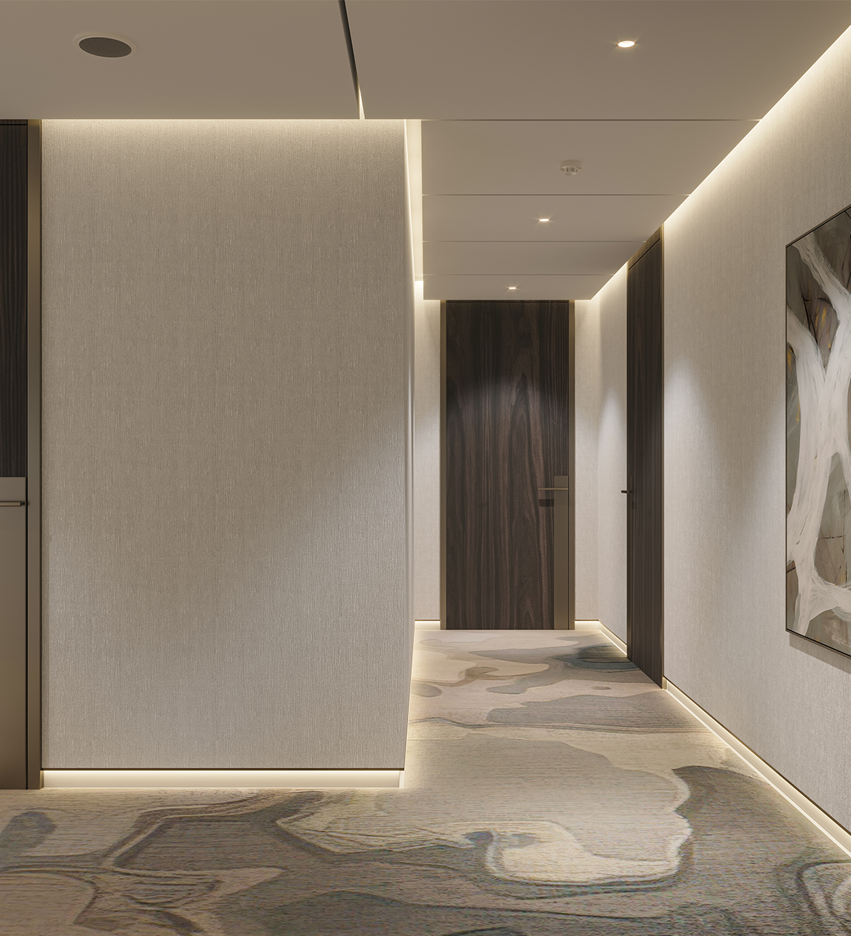 В коридоре гостиничный ковролин и подсветка по периметру, создающие уютную атмосферу.